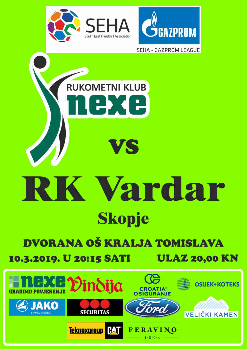 Još su samo dva kola do kraja redovnog dijela natjecanja u SEHA Gazprom ligi u kojoj ove godine RK Nexe postiže odlične rezultate i trenutno je na drugom mjestu. U 17. predzadnjem kolu u nedjelju u Našicama nas očekuje novi rukometni spektakl jer nam u goste dolazi ekipa RK Vardar iz Skopja koja je trenutno na prvom mjestu lige s tri boda više od naših Gromova. RK Vardar bio je prvak Europe 2017., četverostruki je, a također i prošlogodišnji pobjednik SEHA lige. Ove sezone plasirao se u osminu finala Lige Prvaka gdje će igrati protiv ekipe PPD Zagreb. U Vardaru igra veliki broj kvalitetnih igrača iz Makedonije, Rusije, Slovenije, Srbije, a važnu ulogu imaju i dva hrvatska reprezentativca Igor Karačić i Ivan Čupić. Jesenas u Skopju RK Vardar pobijedio je RK Nexe rezultatom 31:26. Želja je uz pomoć našeg osmog igrača vjernih navijača probati pobijediti ovako jakog protivnika te se probiti na vrh tablice SEHA lige.